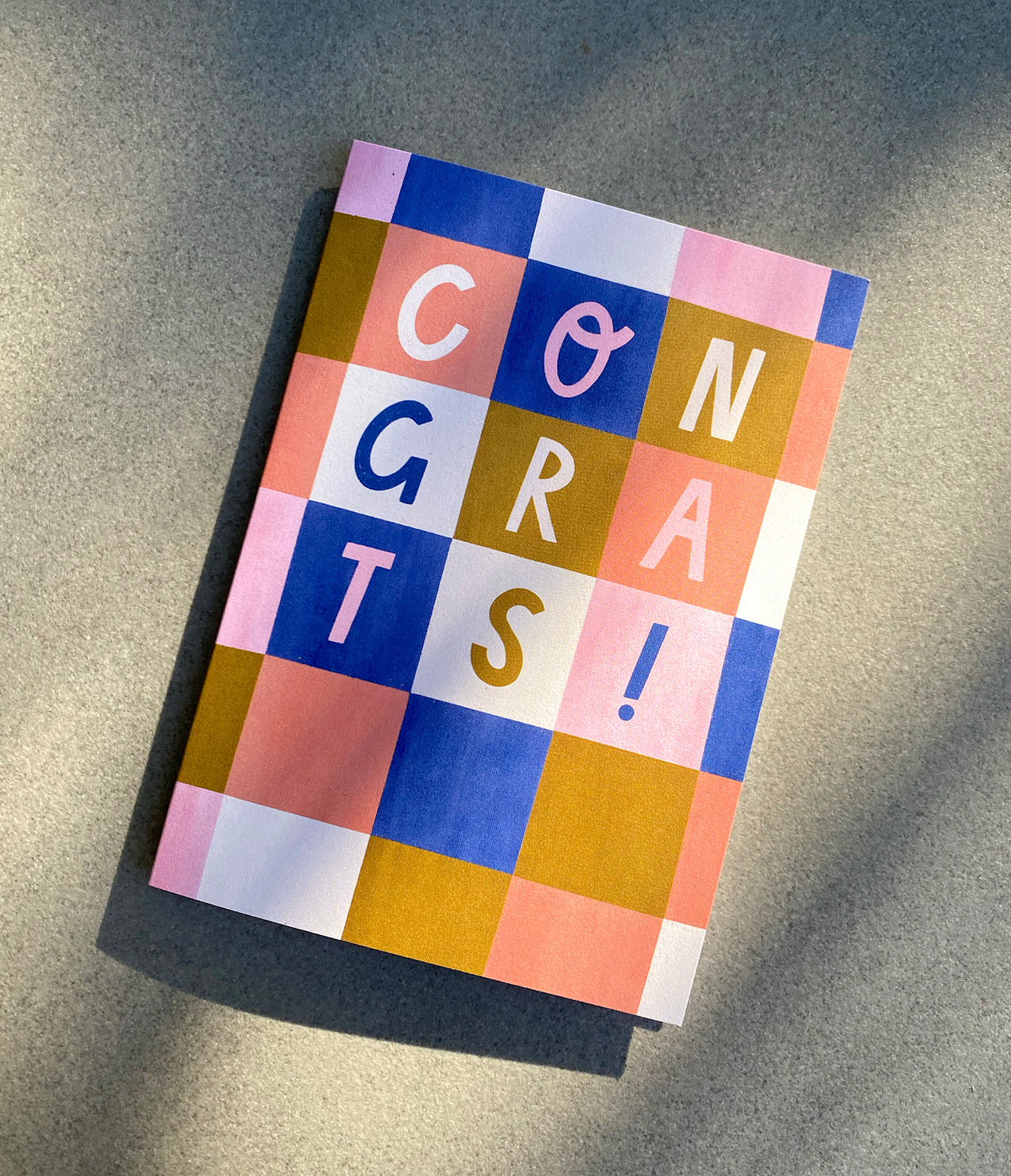 Say "Congrats!" with this bold check pattern, hand-lettered card. The perfect way congratulate someone on joyful news - an engagement, new job, getting into uni or moving house. Blank inside for a personal message.