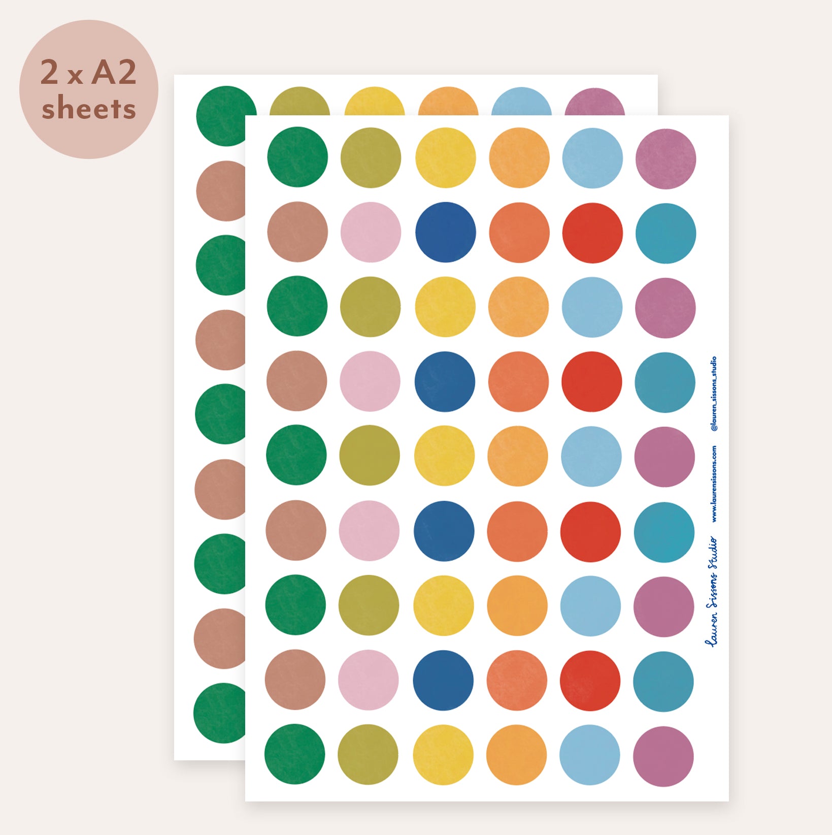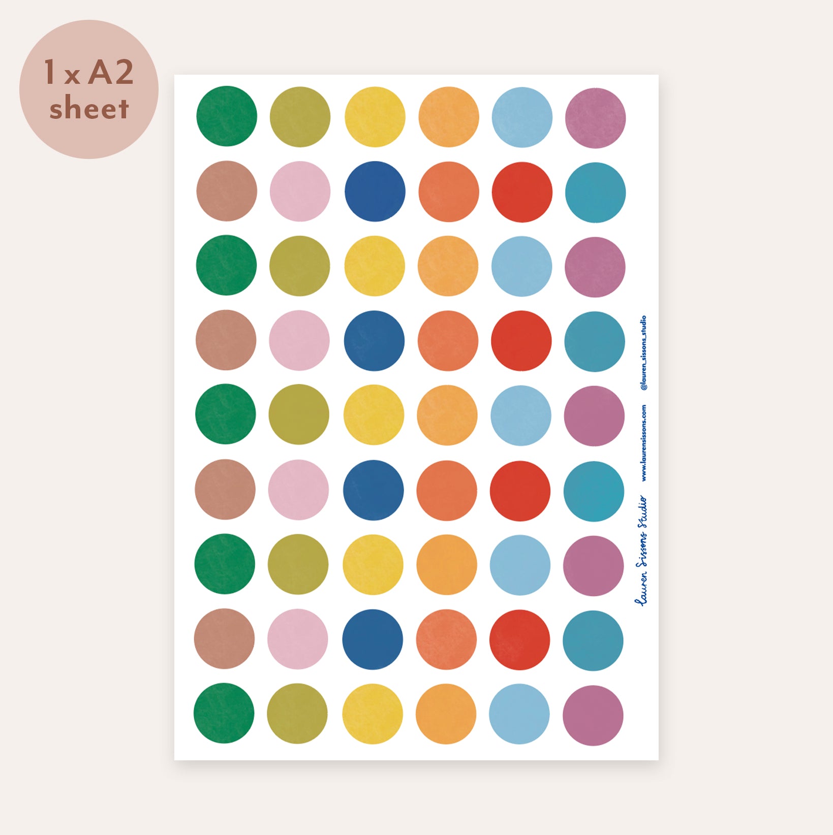 A2 sheet size - includes 54 multicolour dot stickers. Stickers measure 5.2cm diameter