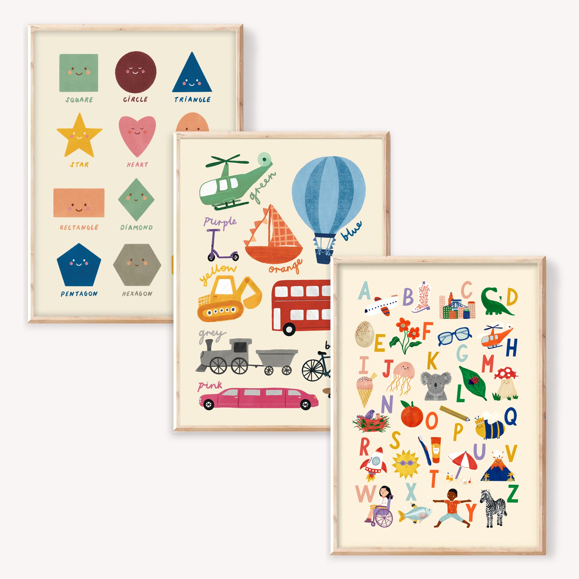 Featuring our bestselling Alphabet A–Z, Transport themed Colours and Shapes art prints in A3 size, this bundle is perfect for curious little learners. Thoughtfully illustrated to engage young minds, each print brings fun, colour and imagination to early learning.
