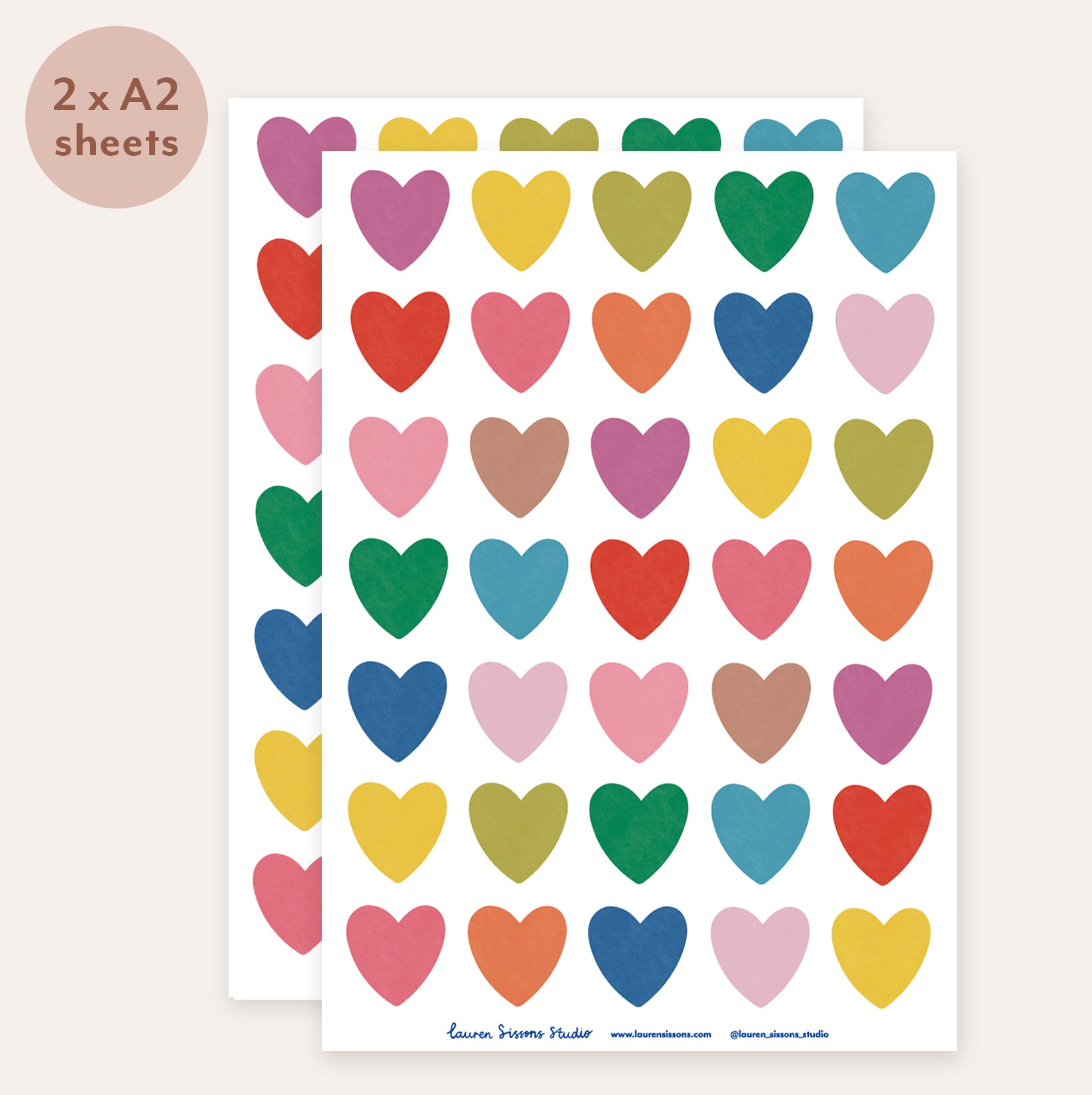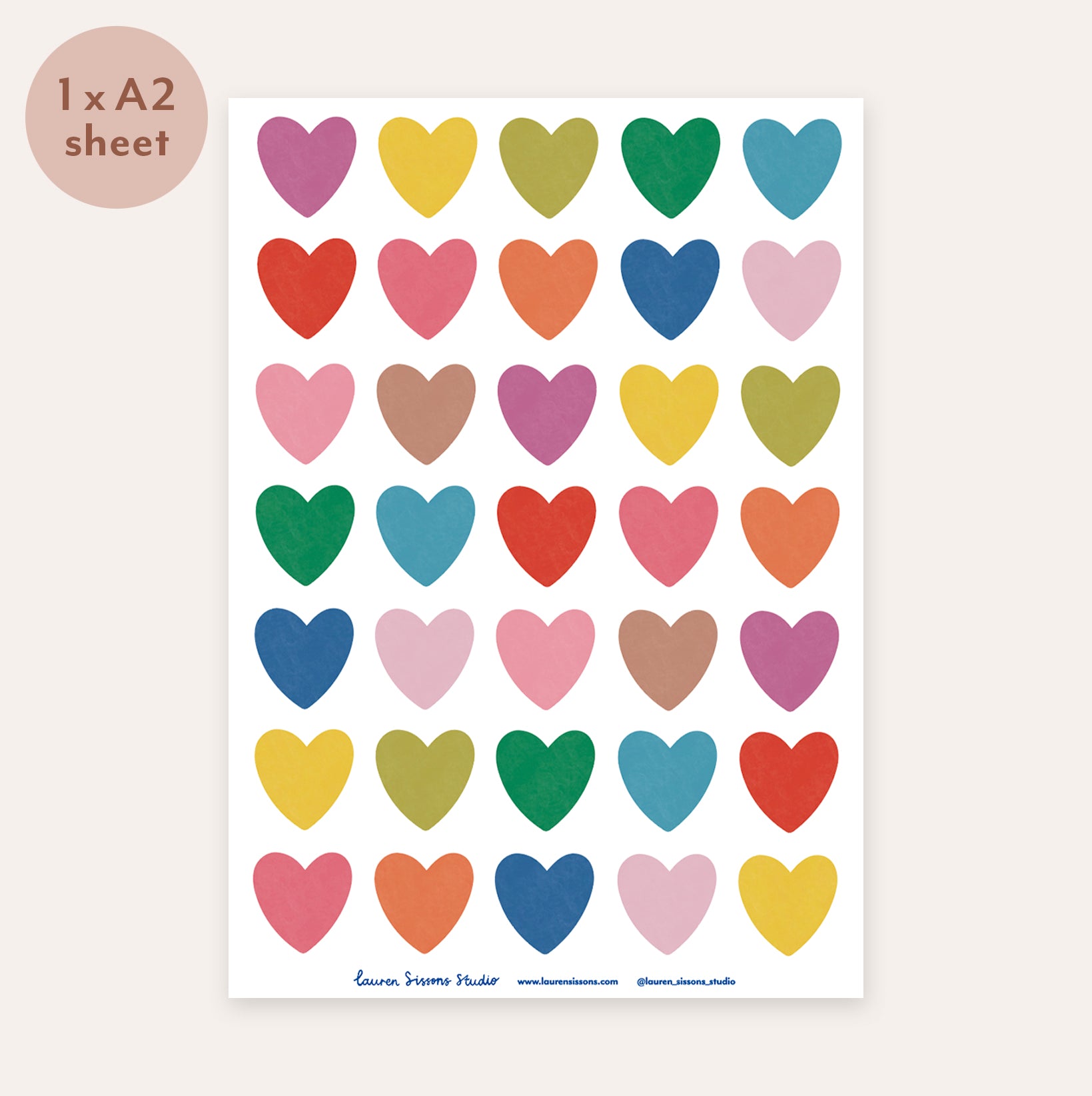 A2 sheet size - includes 35 multicolour heart stickers. Stickers measure 6.5cm diameter