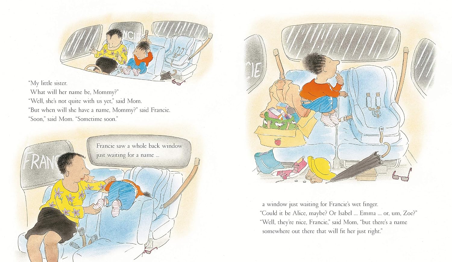 The rain is pouring down in buckets, and Francie and her mom are on their way home from Grandma's. As the little red car pulls into a picnic area to wait out the storm, the windows fog up, and Francie spells out Dad, Mom, and Francie with her finger. But the back window is waiting for another name, that of Francie's soon-to-arrive baby sister.