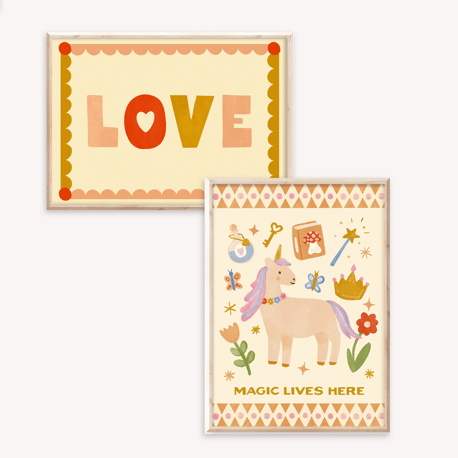 Add a touch of wonder and sprinkle of magic to any space with this uplifting duo - perfect for playrooms, nurseries, bedrooms or any space that celebrates kindness and imagination. Featuring our LOVE print and the adorable "Magic Lives Here" design, this bundle inspires joy, self-belief and a little everyday magic for growing hearts and minds.