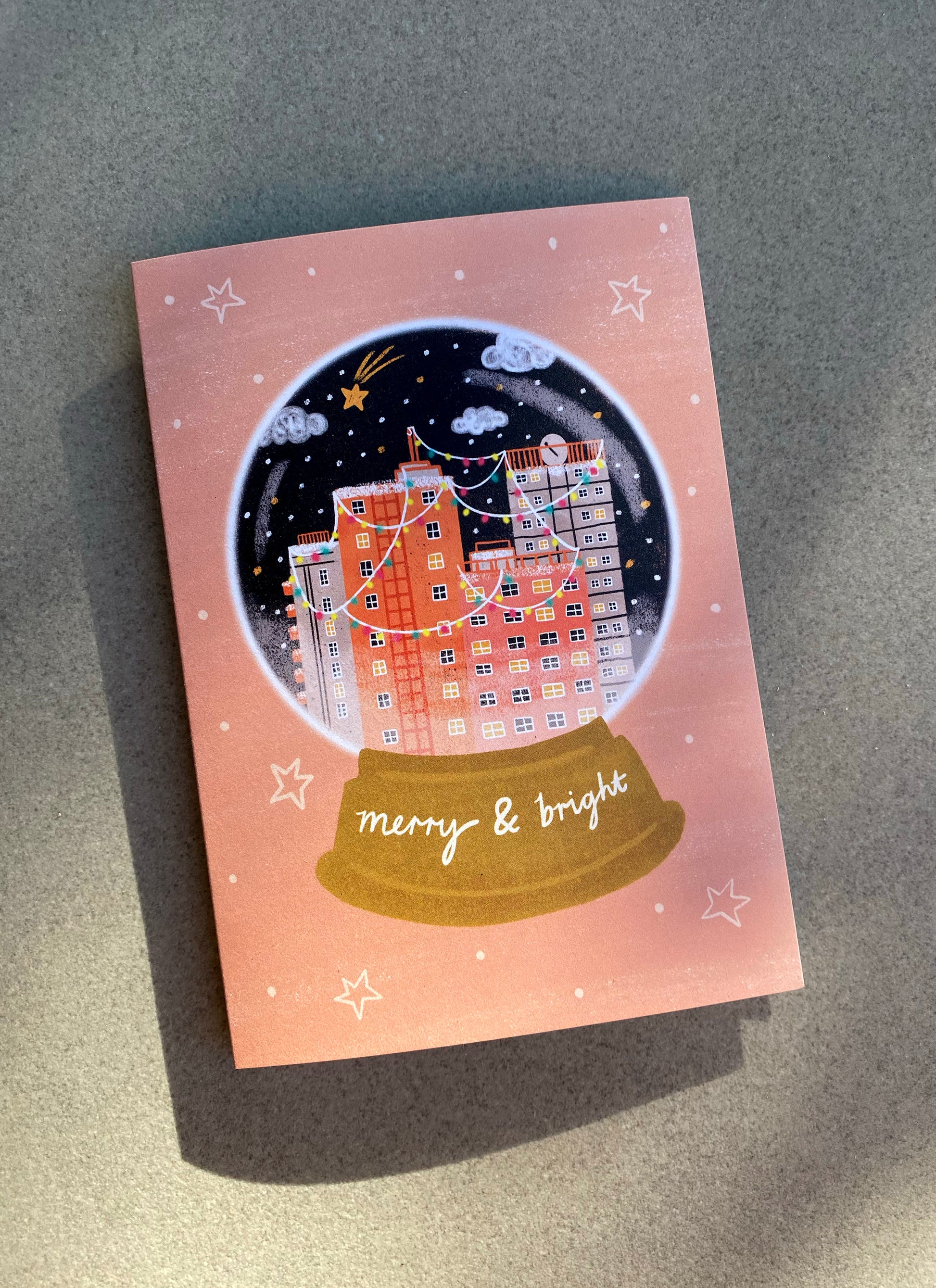 Illustrated "Merry & Bright" holidays card. Set upon a dusty pink background, a festive snow globe is filled with a city skyline and twinkling fairy lights with a sprinkling of snow. Blank inside for a personal message