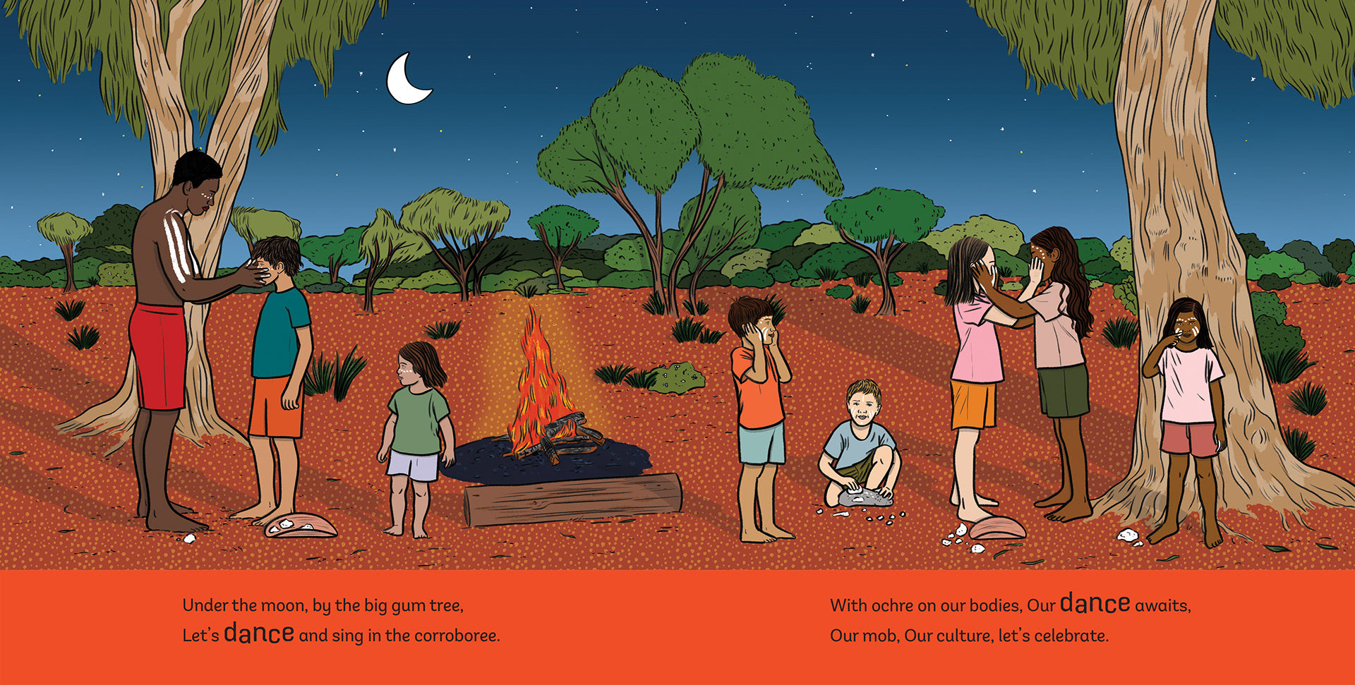 With ochre on our bodies, Our dance awaits,