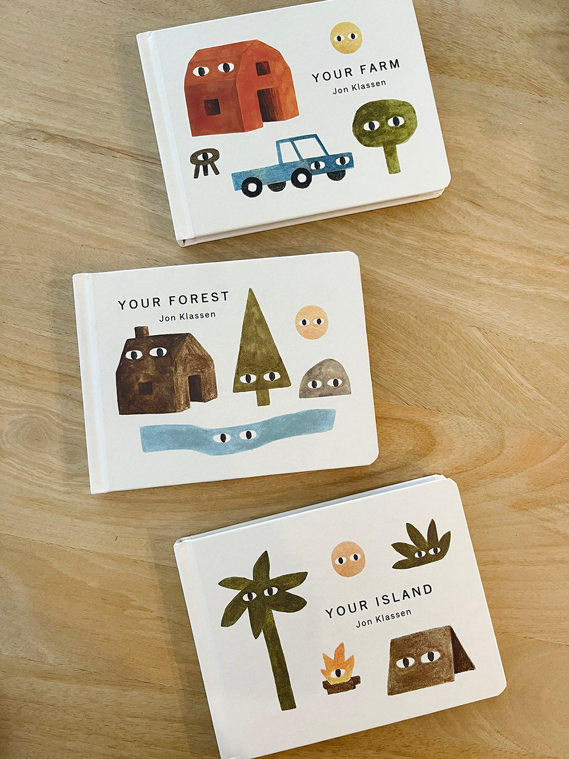With a minimal tableau of familiar objects and a gentle rhythm suited for reading aloud, an island and all its items – a tent, a fire, a boat, a bird – are assembled, ending with bedtime as the sun goes down. This is an island for a young child to have whenever they want to go there. One in a trio of board books focusing on safe spaces, comfort and imagination, Your Island signals both a departure for Jon Klassen and a story whose peculiar touches of whimsy stamp the book as iconically his.